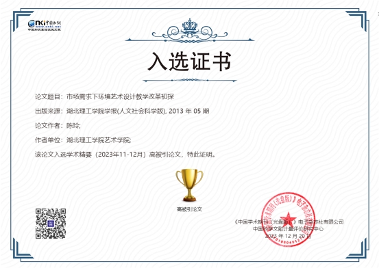近日,6686陈玲老师的论文《市场需求下环境艺术设计教学改革初探》,入选《中国知网(CNKI)学术精要》(2023年11-12月)高被引论文。此论文发表于2013年05期《6686体育学报(人文社会科学版)》上。