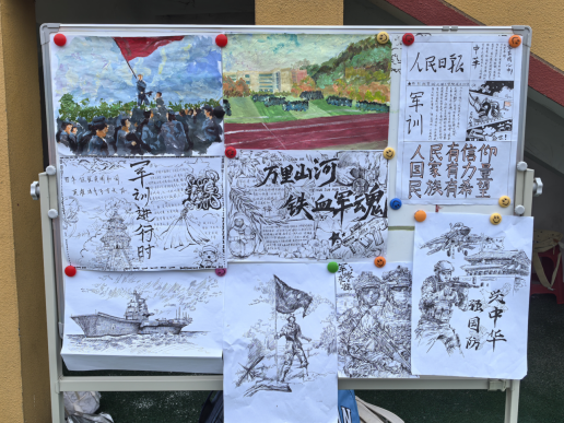 在宣传组的工作区,艺术创作的氛围格外浓烈。大幅展板上,同学们运用娴熟的素描与色彩技巧,将军人坚毅的神态、训练场上的动态瞬间与艺术设计的抽象元素巧妙融合,构图精妙,笔触生动,引得过往师生纷纷驻足。