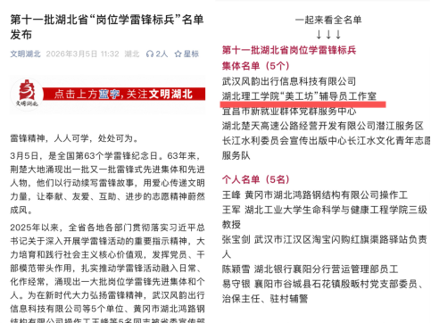 本网消息 3月5日,在第63个学雷锋纪念日到来之际,中共湖北省委宣传部公布第十一批湖北省岗位学雷锋标兵名单,6686“美工坊”辅导员工作室等5家单位被命名为“第十批湖北省岗位学雷锋标兵”(集体),是全省高校唯一入选集体。