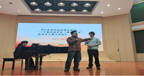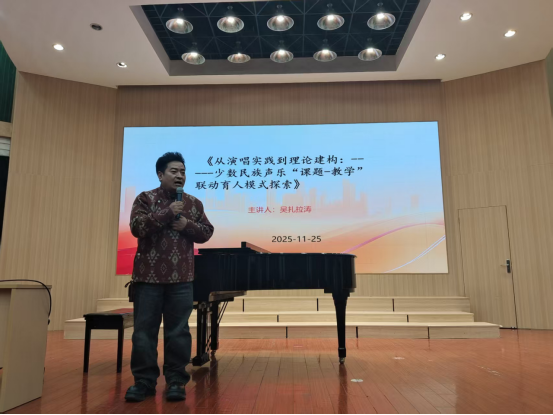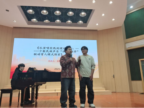 前半场,吴教授结合自己的求学经历及研究方向,为师生们分享了其在少数民族声乐研究方面的成果及教科研申报的经验,系统阐释了少数民族声乐的艺术特质和传承价值。他以少数民族声乐演唱技巧为切入点,延伸到理论体系的搭建逻辑,提出了“以课题促教学,以实践强育人”的联动模式,为在场的师生提供了全新的学术视角与教学思路。