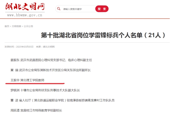 本网消息 3月5日,中共湖北省委宣传部公布了“第十批湖北省岗位学雷锋标兵”(个人)命名名单。其中,来自公司6686的王振华老师光荣上榜。